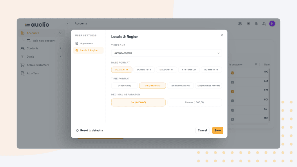 Users can now set regional preferences in their profile settings, including date/time format and number decimal symbol (comma or dot). These settings are applied throughout the application for a localized experience.
